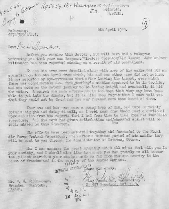 Also included here is of the letters sent to John Williamson's family as they seemed (to me(L)) to be more consolatory.