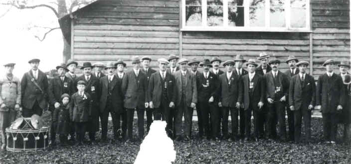 Nothing is known about this photo but it was taken outside the YMCA building. A couple of the men can be seen holding instruments and most are wearing medals. It is suspected that it was taken on a Remembrance Day |