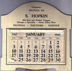 A novelty I guess that these free-standing calendars (the back support can just be seen at the bottom of the picture) were given away free by Mr Hopkin. They were made from 1/8 inch thick cardboard. Telephone Feltwell 258 Salt Beef and Pickled Tongues Sausages a Speciality Home Killed Meat |