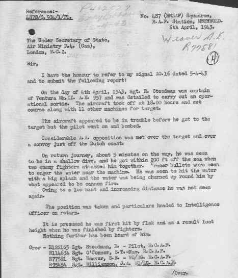 Syn. #487 stopped using Venturas after a disastrous raid on Amsterdam May 3, ‘43 in which 12 aircraft and all men except three perished. You will see that if Sylvan had not perished April 4, he may have succumbed in later raids. An interesting note: the moto of Sqn. #487 was: Ki te mutunga, which in Māori meant, 'Through to the end. The Squadron badge was a tekoteko (carved sculpture of head and body of a Māori warrior) holding a bomb.