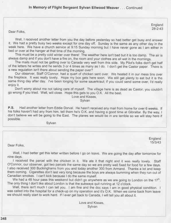 I(L) will include the letter from the Under Secretary of State of the British Air Ministry as the next page. Following that will be two pages including three letters written home. I(L) will include some comment about some of the letters. The third one March 15, 1943 was written three weeks before he was lost but probably wouldn't have been received until much later presuming mail did not go by air. Sylvan's folks were notified of his death by telegram. In his letter Feb. 28. '43 he commented that he either was in bed (not accustomed to the cold, humid climate of England winters) or over at the hangars (there had been lots of mechanical failures with the Venturas), so l(L) think there would be plenty of questions directed at the ground crews. And then the last line in that letter heralding the 'Weaver' sense of humour. His last letter sent home, March 3, ‘43 was written 2 days before he went on a 9-day leave. It appeared that he had a few trips into London. One of those may have been to the R.A.F. hospital (used for Canadian soldiers also) in Uxbridge (a borough of London) where he had been called in for a check-up on his operation.