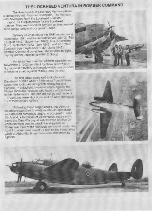 Operation Oyster was a R.A.F. Operation/raid carried out with daytime medium bombers among which Venturas of #487 R.N.Z.A.F. (Royal New Zealand Air Force) were used (flying at low altitudes of 100ft for which they were not designed) so as not to kill Dutch civilians i.e. they could see what and who they were bombing and the Dutch could see them coming. In spite of this precaution, 150 civilians became casualties. As l(S) said I missed it by 10 days. It took place December 6, 1941 after a month of careful planning and training for it. I arrived in Feltwell December 3 but did not get T.O.S. (Taken on Strength) into Squadron #487 until December 16. Because I was not a part of the preparation and also not yet T.O.S. into Sqn. 487 I was not involved. I heard all about it though and how many planes were lost and 7 soldiers killed. Oh well, this was the reality of war.