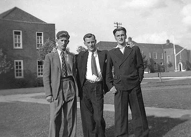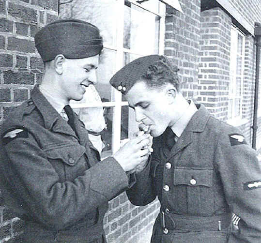 This photo was taken at Feltwell in December 1949. It shows Danny Cawthra, from Halifax (left) and myself, Derek Routen. I was on demob. leave, hence the 'best blue' uniform. Just a few days from 'civvy street'. |