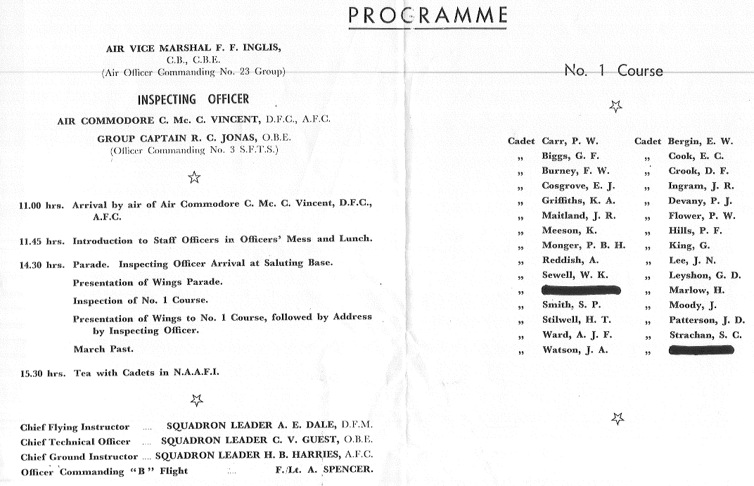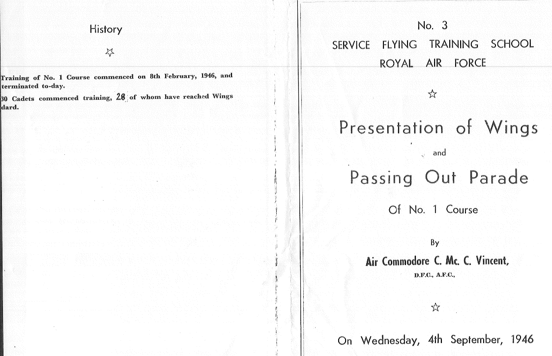 The Presentation of Wings and Passing Out Parade Of No. 1 Course was by Air Commodore C. Mc. C. Vincent, D.F.C., A.F.C. and was held at the Castle Hotel, Downham Market.