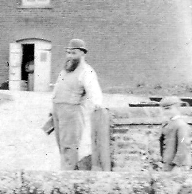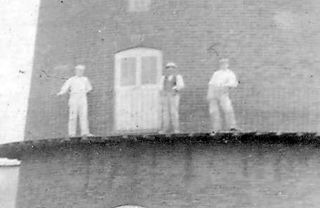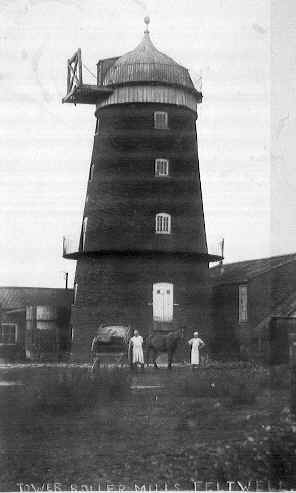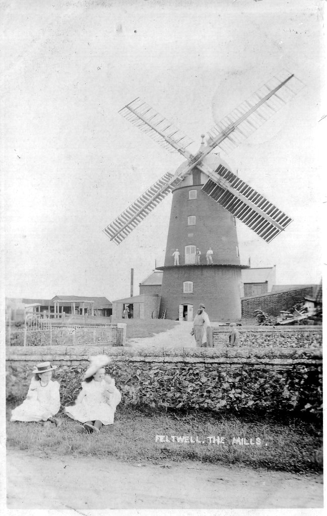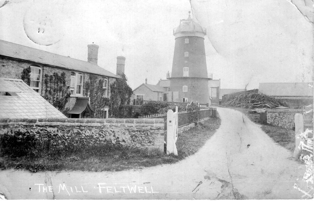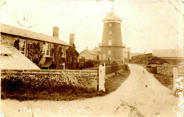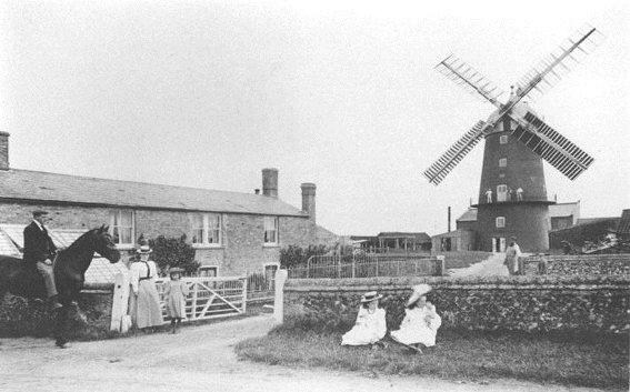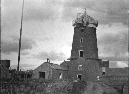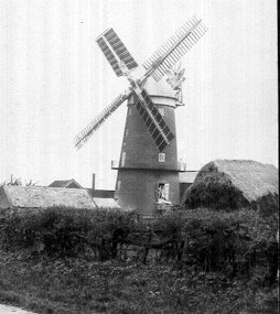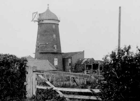 The Sails and spindles were ripped out during storms in 1908 and a few years later. Due to friction, fire was a hazard. The Mill was damaged by fire in 1927 It was considered to be a hazard to aircraft and was demolished in the late 1930s. Taken 18/3/32 | This is a very rare photo as the mill displays a sign which reads 'Daren Bread'. The chimney is from a steam generator brought in to replace the sails. Date unknown. Kindly provided by Thetford Museum. |